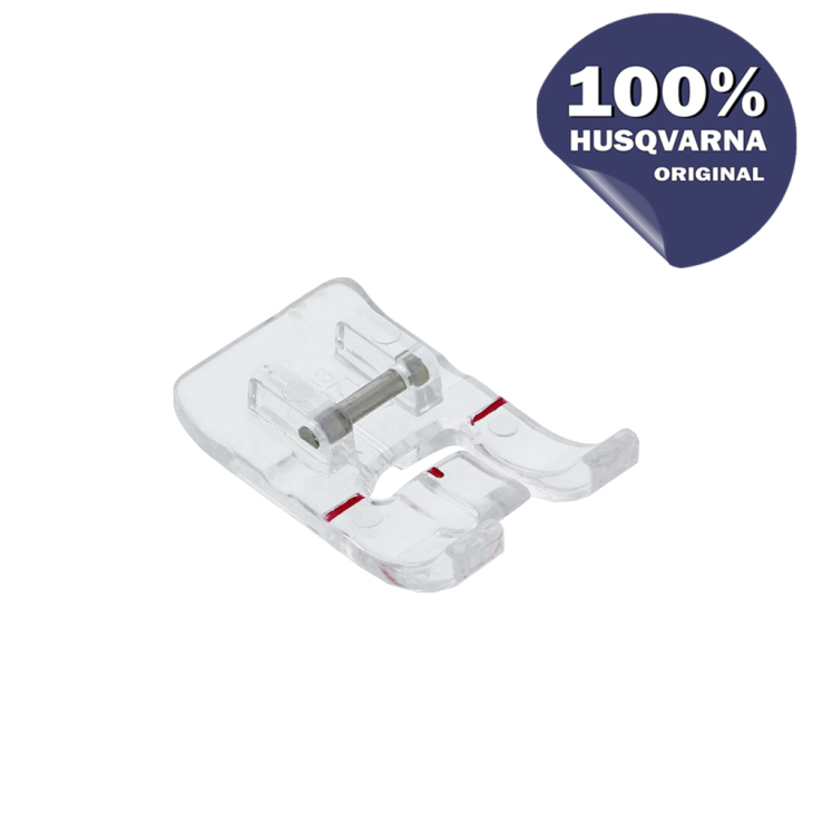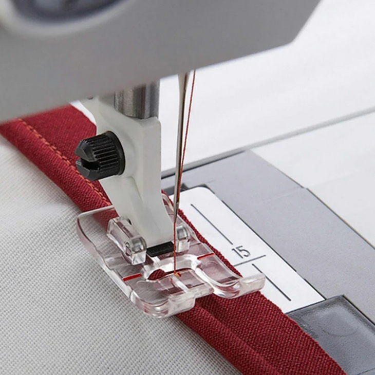 Вшивайте тесьму или кант в швы для придания изделию профессионального облика. Благодаря прозрачной лапке, вы можете видеть положение первой строчки и можете отрегулировать положение иглы так, чтобы следущая строчка шла рядом с первой. В этой лапке есть специальное углубление снизу для канта.