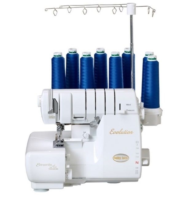 Багатофункціональний швейний апарат BabyLock Evolution BLE8W-2, оснащений 8 нитками (по чотири для оверлочних і плоских швів), виконує рядок в 16 мм, що забезпечує фабричне якість пошиття предметів одягу, текстильних аксесуарів і легких оббивних матеріалів.