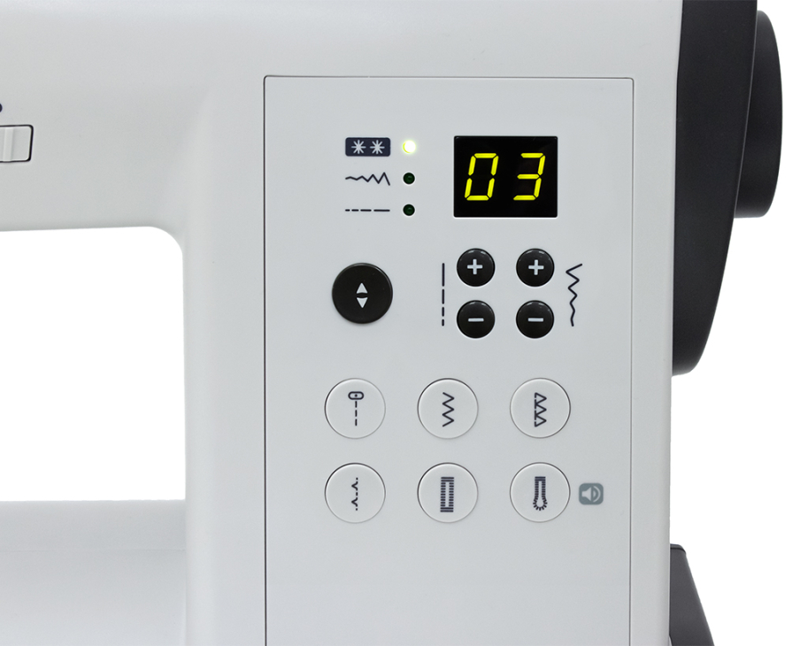Модель має горизонтальний човник, що забезпечує тиху та стабільну роботу навіть за тривалого використання. LED освітлення дозволяє шити за будь-яких умов, а зручний дисплей робить керування функціями інтуїтивно зрозумілим.