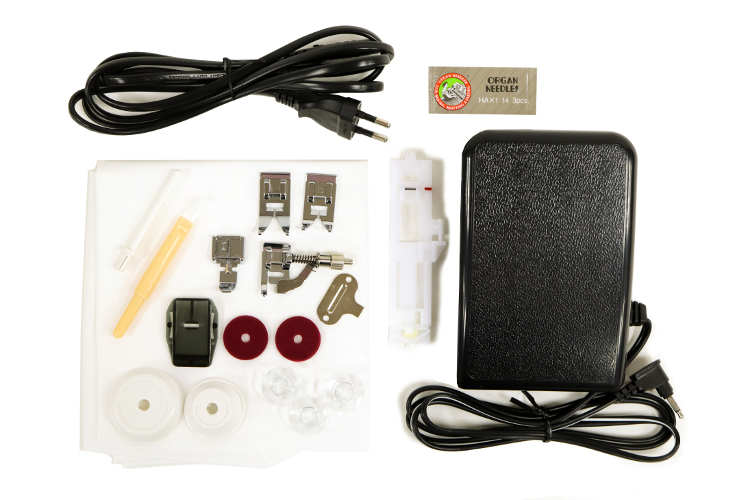 Крім цього, в комплекті з моделлю виробник постачає м'який чохол, набір голок, 5 видів лапок, распариватель, викрутку, пластину для штопання, шпульки, стрижні і обмежувачі котушкові.