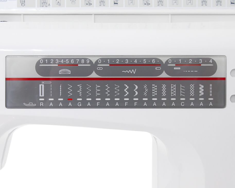 На передній панелі розташовані регулятори довжини стібка від 0 до 4 мм та ширини зигзагу до 6,5 мм, що дає можливість точно налаштувати машину під конкретну тканину та завдання. Кнопка реверсу використовується для закріплення рядка та запобігає її розпусканню.