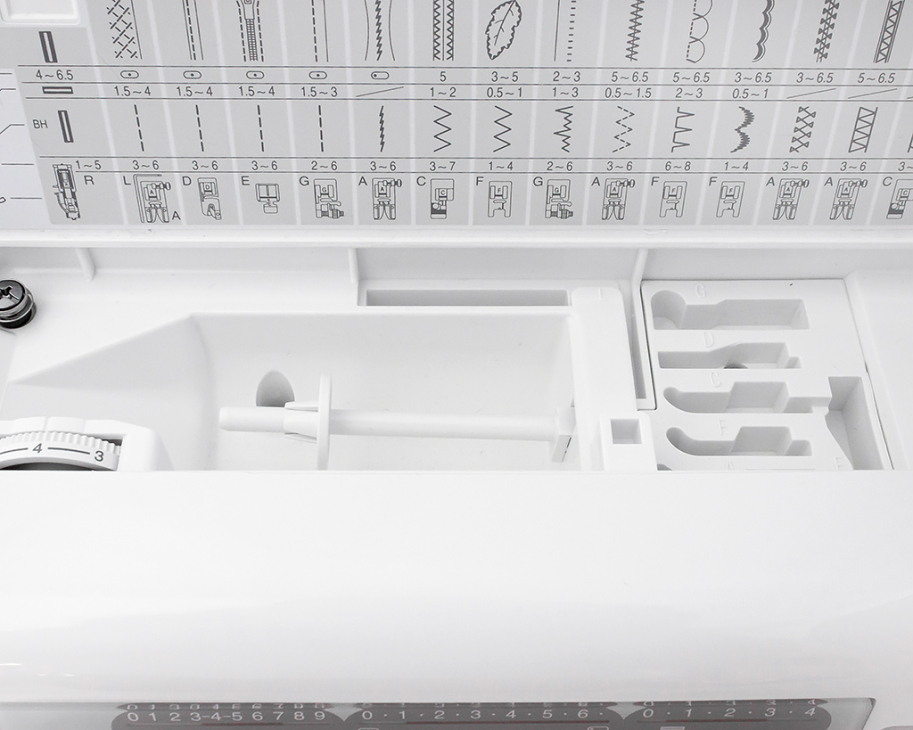 Горизонтальний човник забезпечує плавний хід, низький рівень шуму та мінімальні вібрації під час шиття. Прозора кришка шпульного відсіку дозволяє контролювати залишок нитки, а просте заправлення знижує ризик помилок. Така конструкція підвищує довговічність вузла та гарантує рівний рядок на тканинах різної щільності.