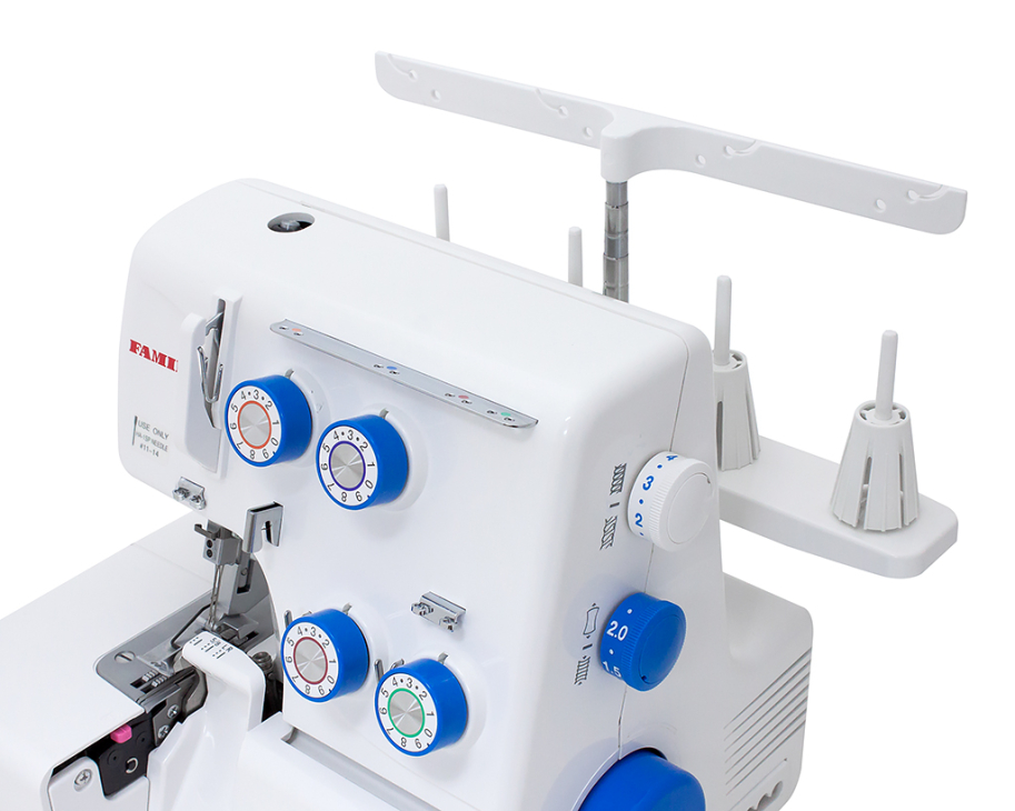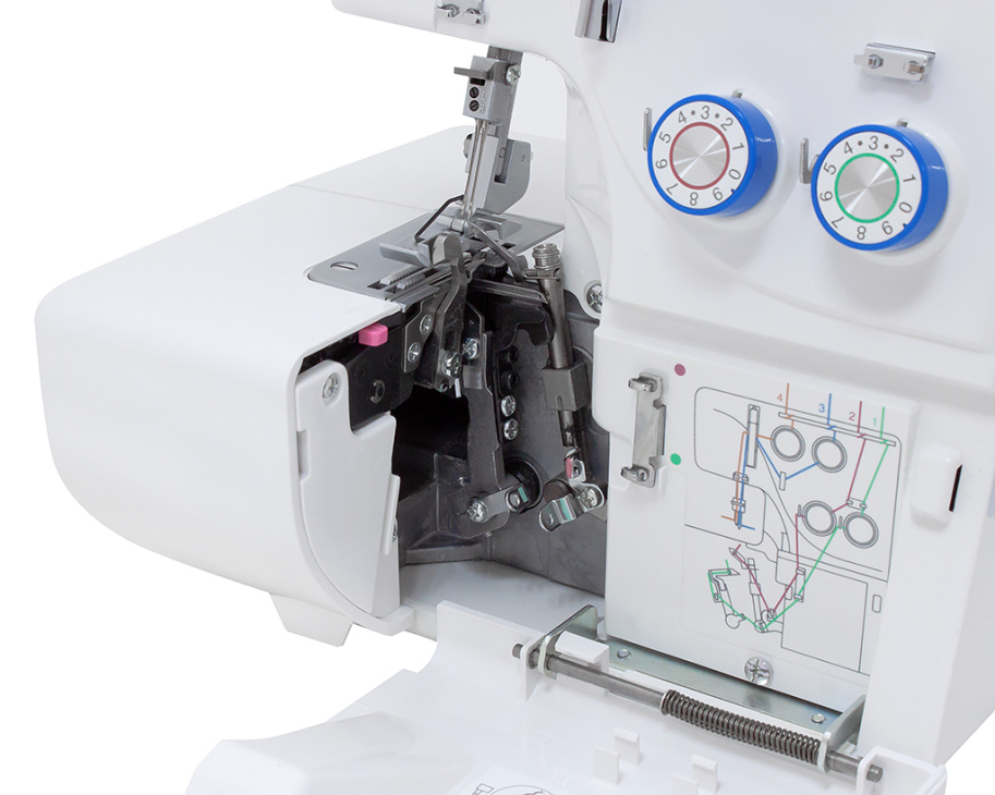 На передній панелі оверлок Family 244D має регулятори для налаштування натягу ниток. Ззаду встановлені тримачі для котушок, від яких нитки проникають через ниткодівачі і проходять до швейних механізмів. На панелі зображено схему, яка є підказкою при заправці.