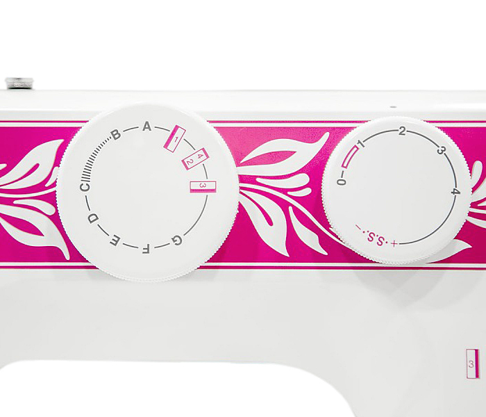 У цій моделі все стандартно. На лицьовій стороні корпусу розташовані два регулятори: перемикач рядка та довжини стібка. Також машина забезпечена регуляторами натягу верхньої нитки і клавішею зворотного ходу - реверс.