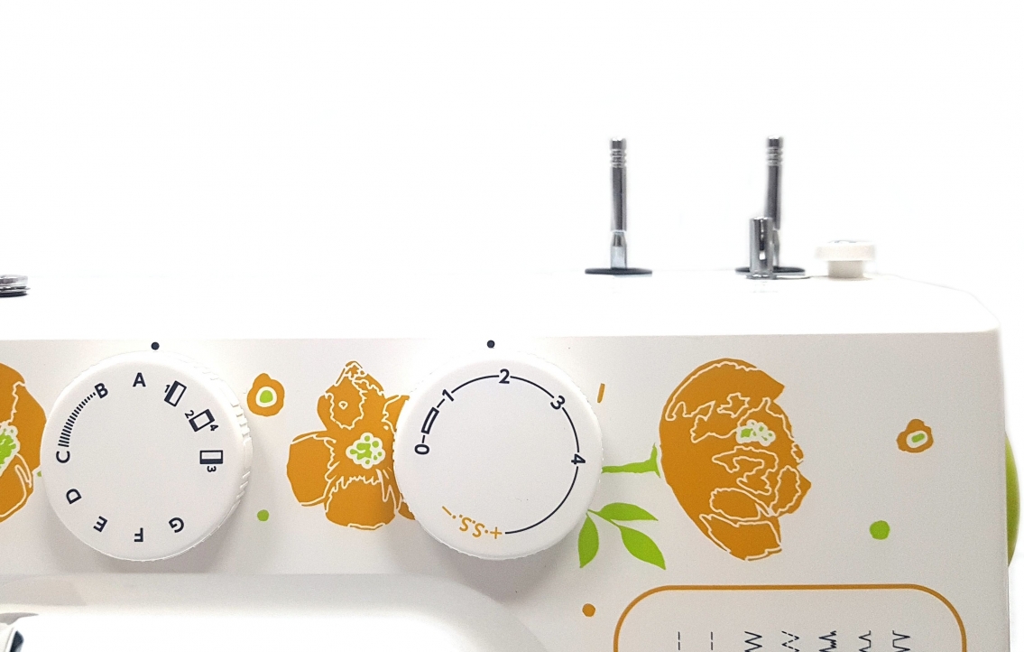 Швейна машина JANOME Excellent Stitch 15А має стильний дизайн. Модель прикрашена яскравими принтами на передній панелі. Завдяки компактному розміру, прилад не займає багато місця, його можна не ховати під стіл.