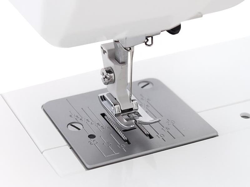 На передній панелі розміщені регулятори довжини стібка та вибору строчки, що дає змогу легко адаптувати параметри під конкретну тканину чи завдання. Графічні підказки з ілюстраціями швів допомагають швидко вибрати потрібну операцію навіть користувачам із мінімальним досвідом.