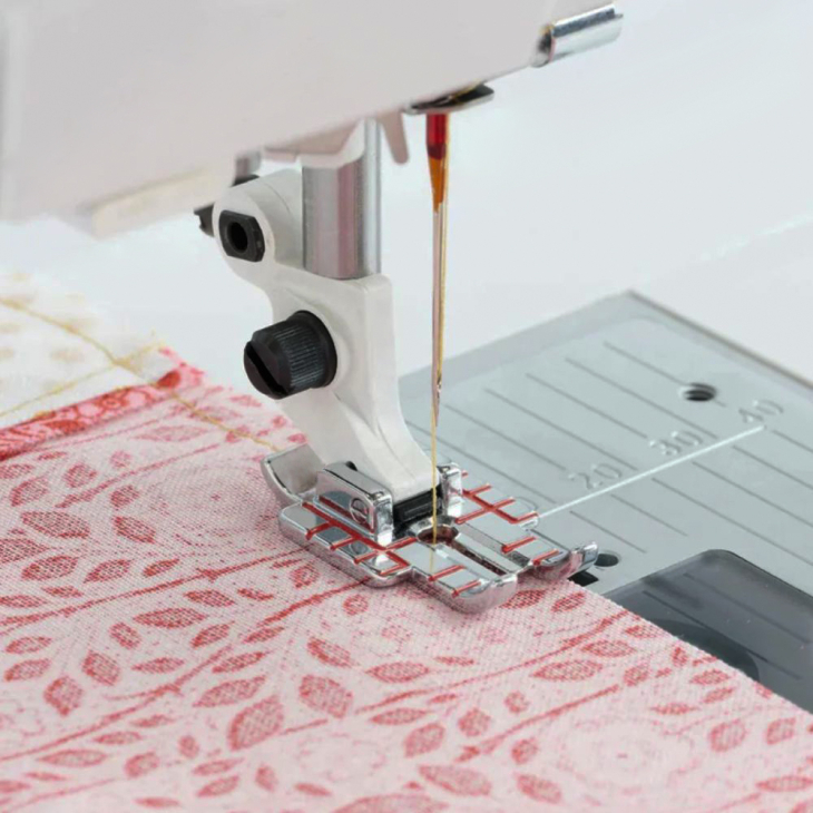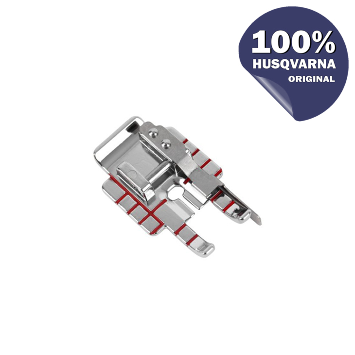 Використовуйте в клаптиковому шитті лапку для відстрочки з направляючою. Овальний отвір у лапці дозволяє точно відрегулювати положення голки. Відстань між центральним положенням голки та направляючою становить ¼” (6 мм).