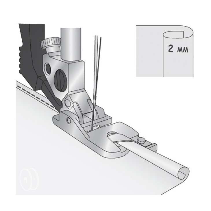 1. Вибрати прямий рядок. Загладити початок майбутнього шва шириною 2 мм. Укласти загорнутий край під лапку і зробити кілька стібків. Залишити голку у тканині для її фіксування. Підняти лапку і ввести край тканини в пристрій лапки, що завиває. Опустити лапку і продовжити шиття, спрямовуючи край тканини.