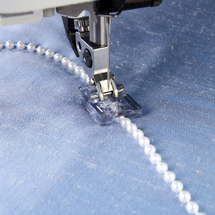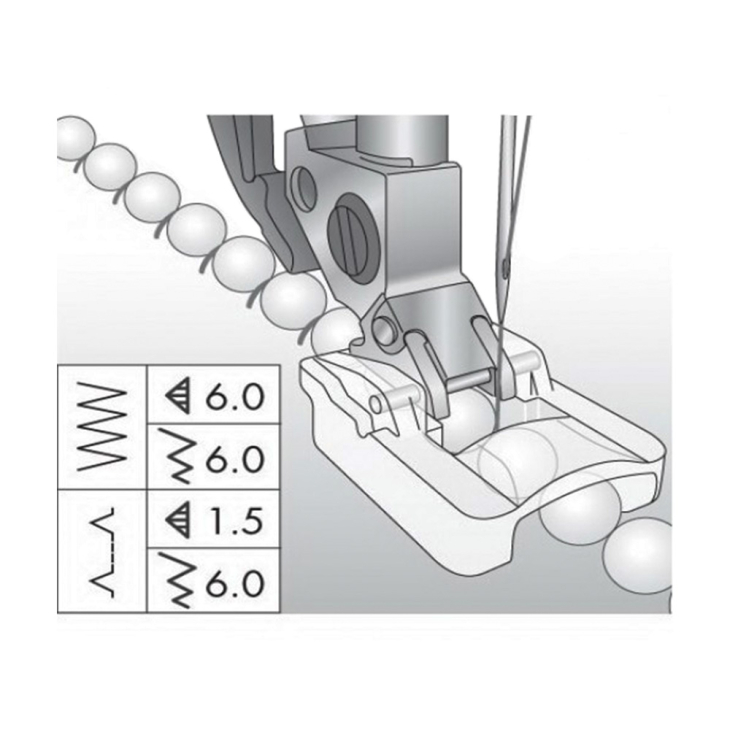 За допомогою цієї лапки ви зможете прикрасити будь-який виріб нитками бісеру або перлів. Намистинки будуть легко прослизати під лапкою в процесі пришивання.