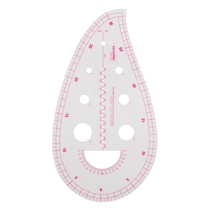 При розкрої пройм, рукавів, горловини та інших деталей одягу вам знадобиться кравецьке лекало у вигляді "Краплі". Воно виготовлене із прозорого міцного пластику товщиною 1 мм, який добре ковзає по тканинах із різною текстурою.