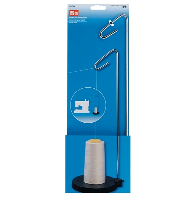 Підставка для великої котушки від Prym складається з чавунної основи з фіксуючим стрижнем зі сталі для вкручування та балкою, яка спрямовує нитку. Так при витратних швейних роботах не потрібно постійно одягати нову нитку в машину.