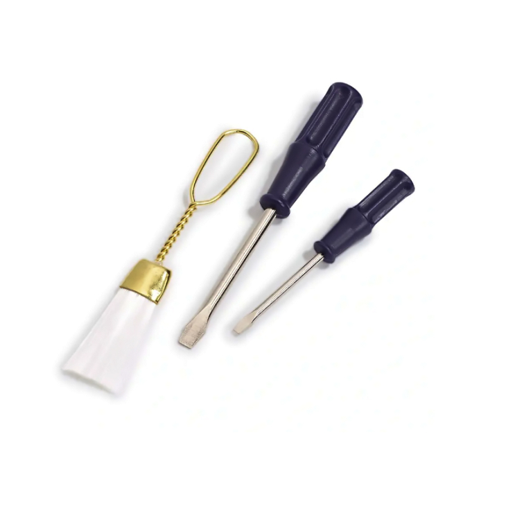 • У набір входять дві викрутки з міцної сталі з ручками сливового кольору з шириною шліцу 2 мм і 5 мм та пензликом нейлоновим шириною 25 мм з латунною ручкою красивої форми. Оскільки щетина виконана з тонких нейлонових ниток, пензлик можна у будь-який час абсолютно просто помити та звільнити від залишків олії. Обидві викрутки добре лежать у руці і тому можуть без проблем викручувати навіть гвинти, що щільно сидять.