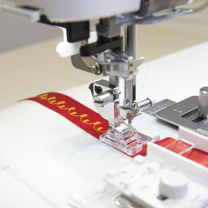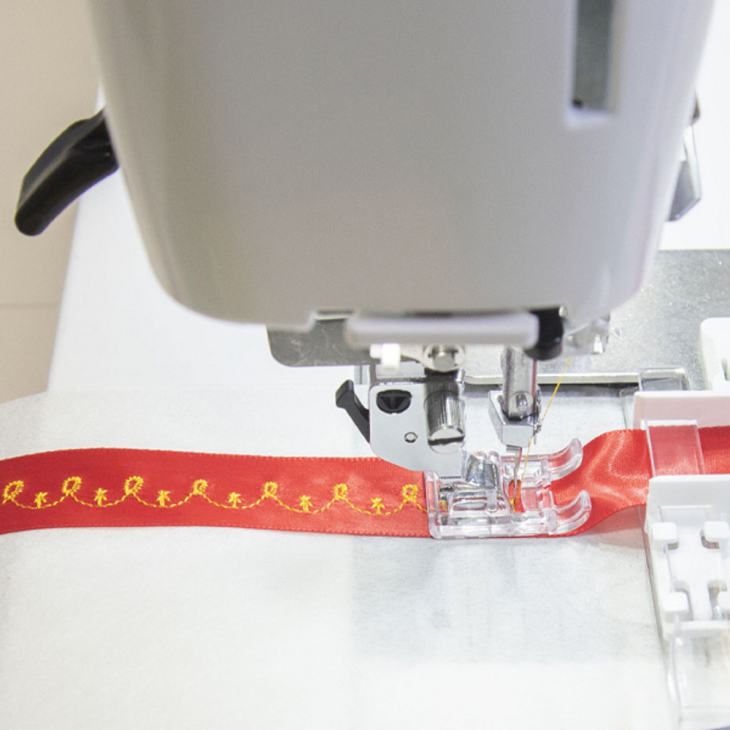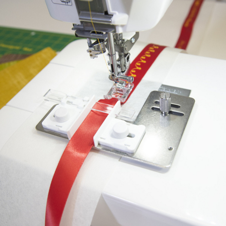 Направник для декорування стрічки допоможе створити оригінальні стрічки, додаючи до них декоративні рядки чи літери. Конструкція направника дозволяє легко встановлювати його, а прозорий направник на ньому допомагає точно контролювати шиття. Додайте більше індивідуальності у ваші проекти.