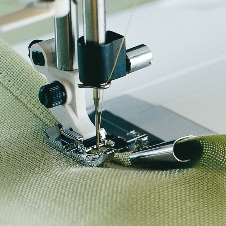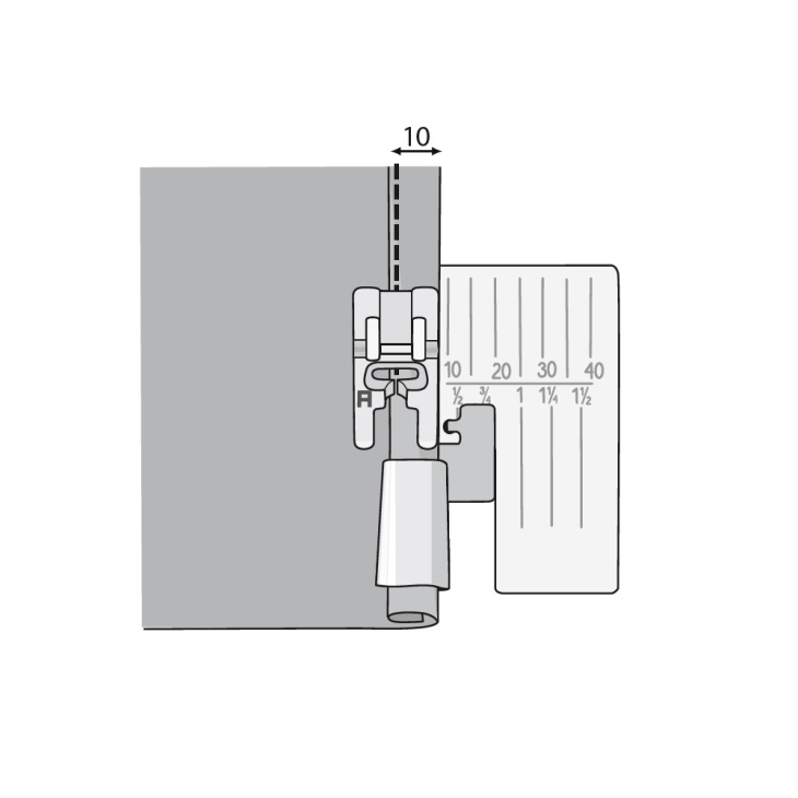 За допомогою цього пристрою ви можете робити подвійне підгинання шириною 10 мм на тонкому або середньому матеріалі. Пристрій встановлюється на голкову пластину на машині.