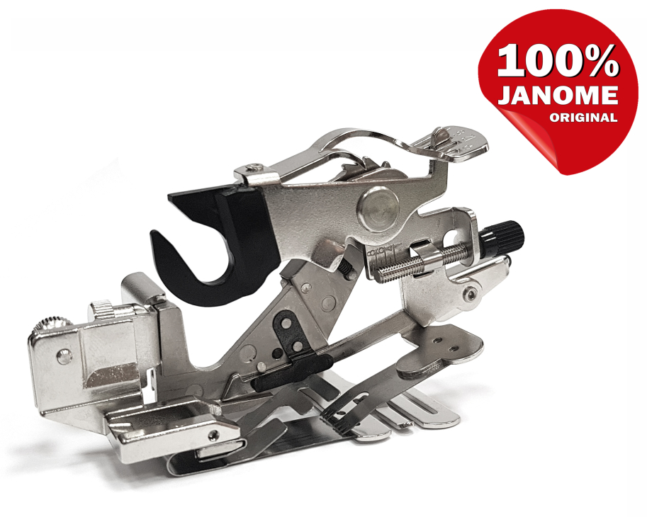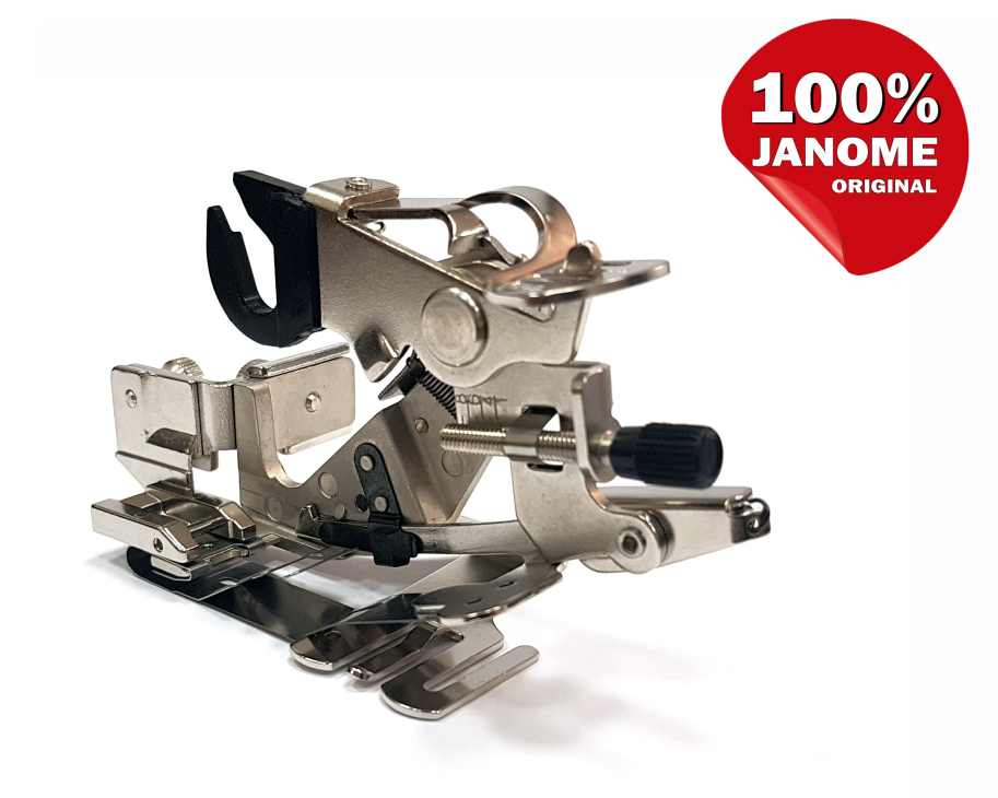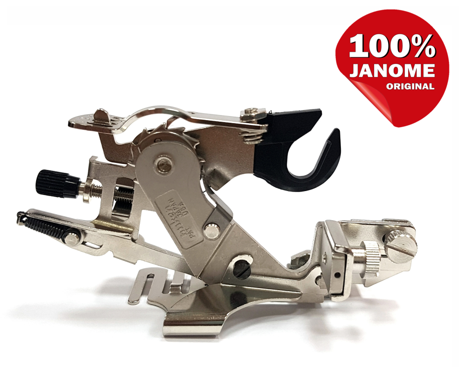 На другому регуляторі за допомогою гвинта встановлюємо глибину складки від 1 до 8 мм. Вставте голкотримач у пластиковий важіль і закріпіть апарат як стандартну лапку. Перед початком роботи перевірте положення голки, щоб вона потрапляла в отвір апарата. Між двома пластинами вкладаємо тканину і шиємо.