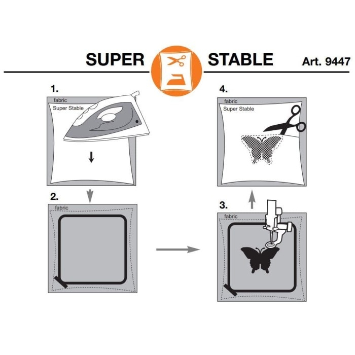 Стабілізатор MADEIRA Super Stable приклеюється за допомогою праски та відрізається після вишивання. Цей стабілізатор використовується під час роботи з усіма видами машинної вишивки. Полотно прогладжується разом із тканиною, тим самим фіксуючи її.