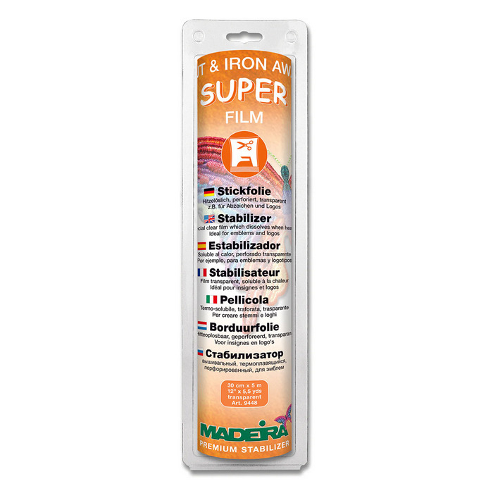 Madeira Super Film - це спеціальний стабілізатор, що розплавляється при високих температурах, наприклад під час прасування. Перфорований стабілізатор Super Film є незамінним для вишивання емблем, так як дизайн легко і рівно відокремлюється. Зайві краї стабілізатора можна відрізати ножицями. Перевага даного стабілізатора перед іншими розчинними у воді стабілізаторами полягає в тому, що він можевикористовуватися при роботі з тканинами, які не можна мочити (оксамит, муар та ін.).